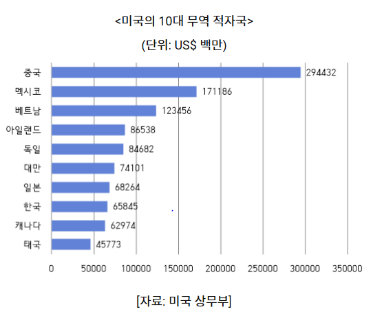 이 세 국가는 2024년 기준으로 미국 상무부가 발표한 무역 적자국 1등, 2등, 3등 국가입니다.
